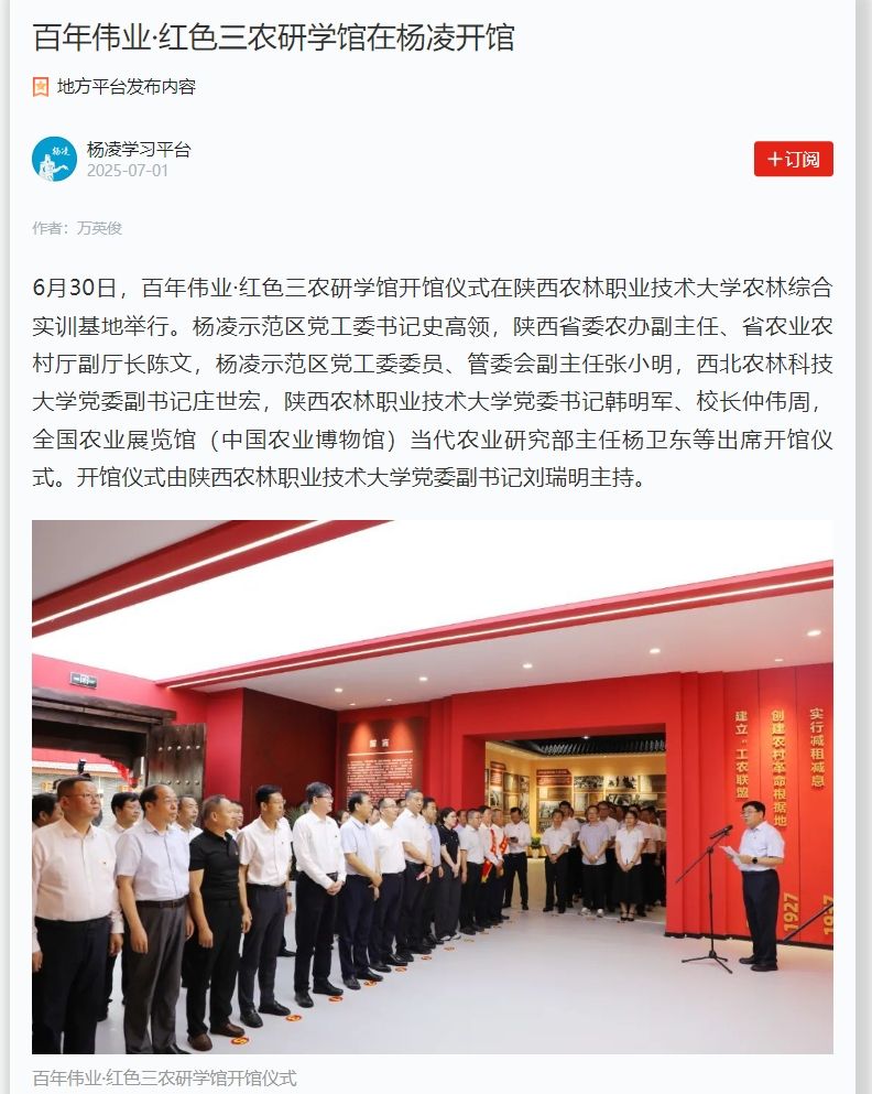 6月30日,百年伟业·红色三农研学馆开馆仪式在bv伟德国际1946农林综合实训基地举行。杨凌示范区党工委书记史高领,陕西省委农办副主任、省农业农村厅副厅长陈文,杨凌示范区党工委委员、管委会副主任张小明,西北农林科技大学党委副书记庄世宏,bv伟德国际1946党委书记韩明军、校长仲伟周,全国农业展览馆(中国农业博物馆)当代农业研究部主任杨卫东等出席开馆仪式。开馆仪式由bv伟德国际1946党委副书记刘瑞明主持。