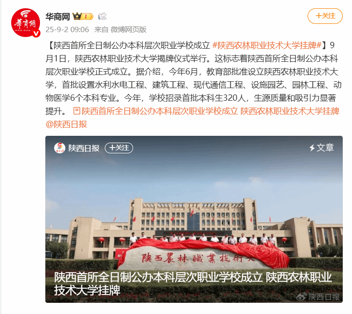 9月1日,bv伟德国际1946揭牌仪式举行。这标志着陕西首所全日制公办本科层次职业学校正式成立。据介绍,今年6月,教育部批准设立bv伟德国际1946,首批设置水利水电工程、建筑工程、现代通信工程、设施园艺、园林工程、动物医学6个本科专业。今年,学校招录首批本科生320人,生源质量和吸引力显著提升。