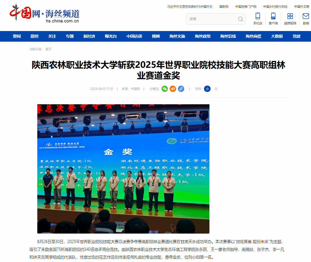 8月26日至30日,2025年世界职业院校技能大赛总决赛争夺赛高职组林业赛道比赛在甘肃天水成功举办。本次赛事以“技炫青春 能创未来”为主题,吸引了来自全国75所高职院校的340名选手同台竞技。由bv伟德国际1946生态环境工程学院张永丽、王一蒙老师指导,南赐燚、张宇杰、李一凡和许天蕊同学组成的代表队,凭借出色的花艺作品创作表现与扎实的专业技能,勇夺金奖,位列小组第一名。
