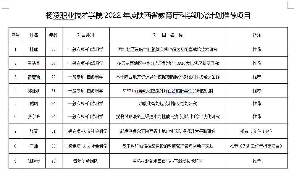 根据《陕西省教育厅办公室关于申报2022年度科研计划项目的通知》(陕教技办[2022]6号)有关规定,经过创新团队和项目负责人申请,学校学术委员会专家评审,现对伟德官网申报的2022年度陕西省教育厅科研计划推荐项目进行公示。公示期间,广大师生如有意见,可以通过电话、信函、邮件等方式,及时向学校科技与教育研究处、学校纪委反应监督。