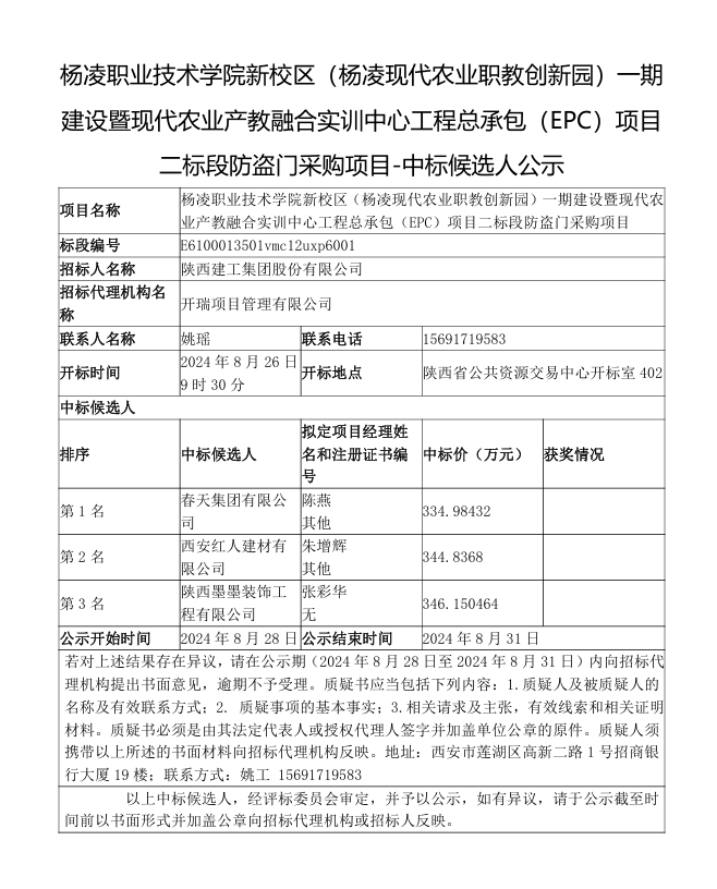 杨凌职业技术学院新校区(杨凌现代农业职教创新园)一期建设暨现代农业产教融合实训中心工程总承包(EPC)项目二标段防盗门采购项目-中标候选人公示