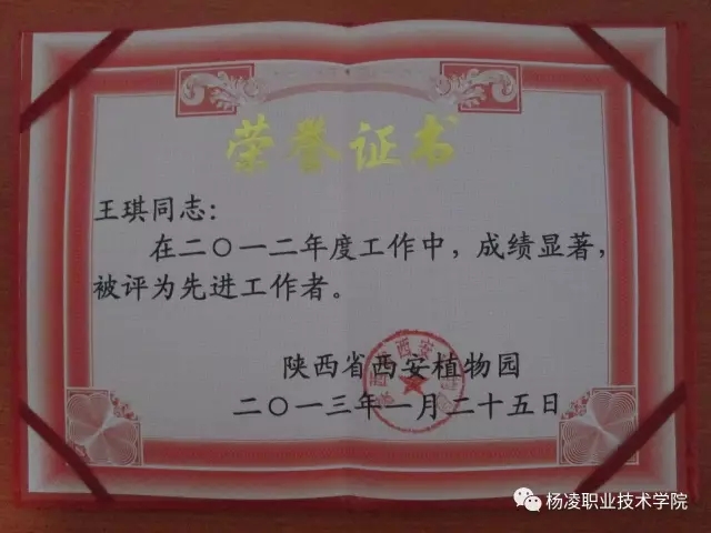 工作表现突出的王琪,连续三年获得西安植物园先进工作者荣誉称号,并被推荐为陕西省岗位学雷锋标兵和第三届“‘中国梦·青年志’——寻找陕西身边的好青年”活动创优类好青年候选人。